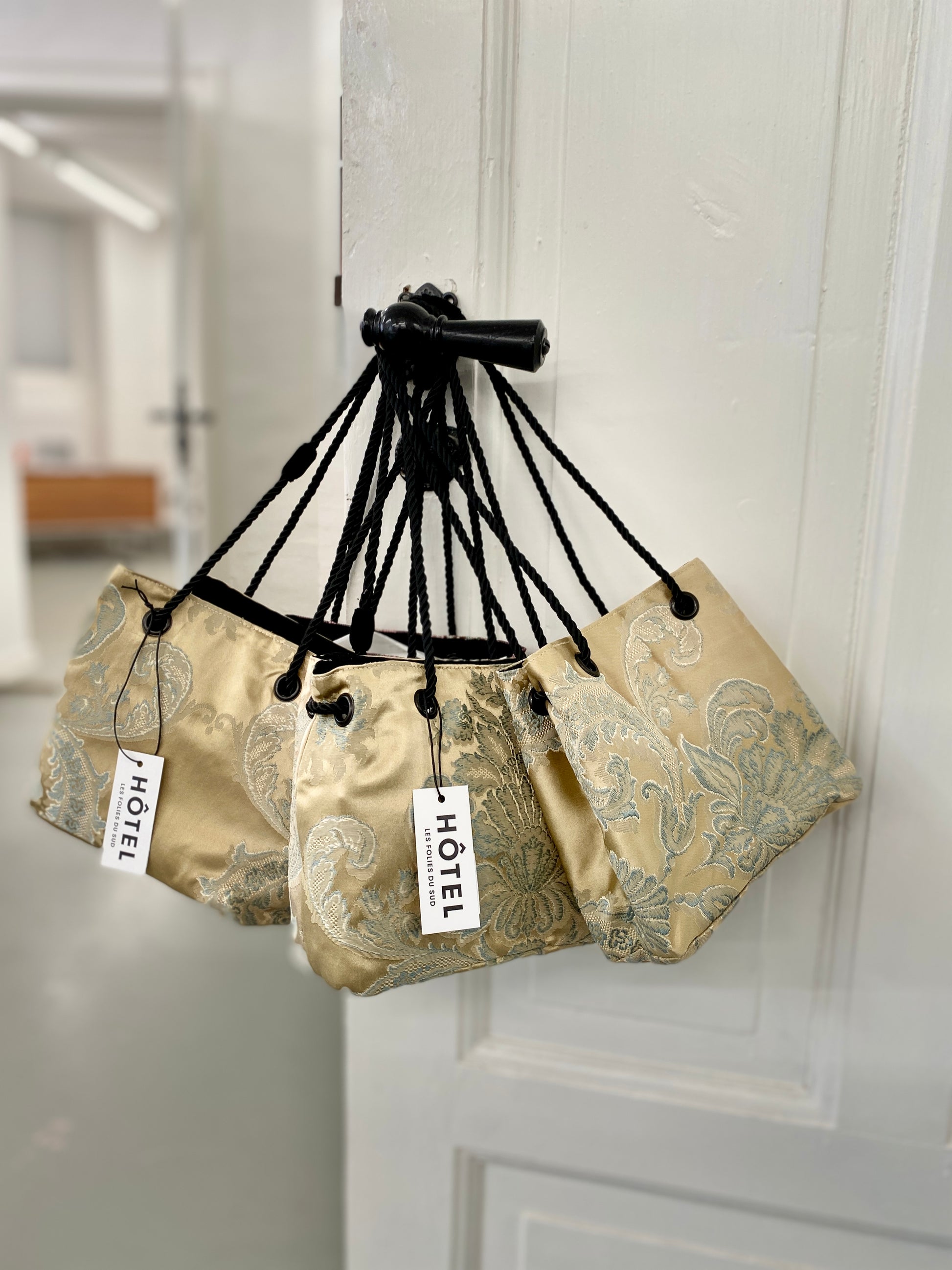 The fabric we use is handpicked by Alexandra and her team, we look for unique and interesting pieces like: Hôtel Parisian embroidered silk, handmade cross stitch, antique cotton lace, appliqué, embroidered tablecloth from the 30ties, one of a kind upholstery fabric, velour de Geneve and colorful cotton sheets. Quality and authenticity is very important to us; Some of the fabrics are imperfect, it is part of their journey and their unique story and charm. Leftover fabrics are used to make accessories, every pieces of fabric is keep in our fabric library.